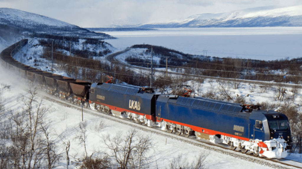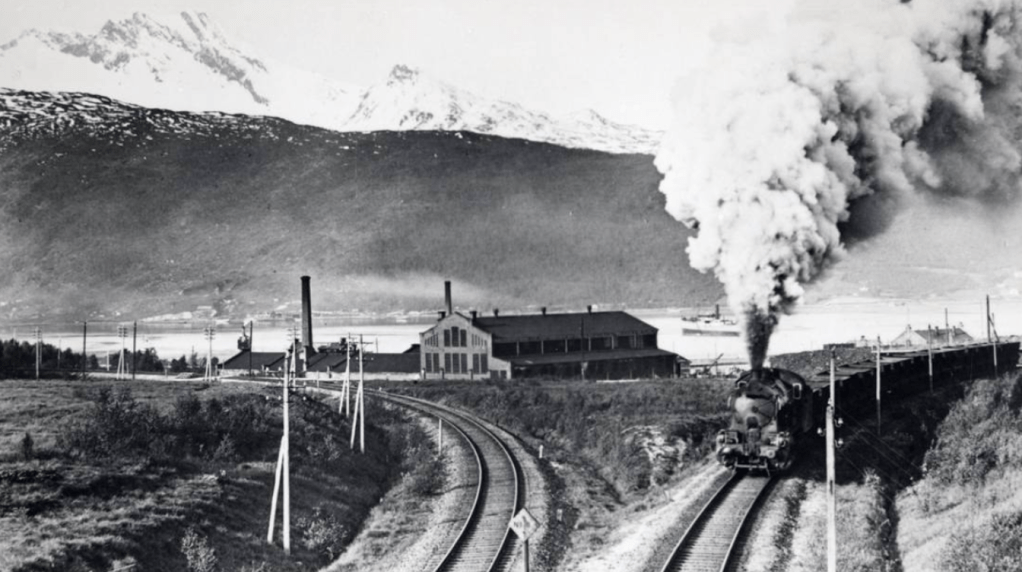 The story of the construction of the Ofoten Line linking Narvik to Luleå in Sweden is a dramatic one. The reason behind the railway line construction lies back in history,1.6 – 1.8 billion years ago! The reason for the railway, the Iron Ore Line, being built is the huge iron ore deposit at Kiruna in Sweden. A port is needed for the export of the iron, but the Baltic Sea freezes so the port at Luleå is not useable year round. Narvik on the other hand is ice free all year due to the North Atlantic Drift, hence its importance. Narvik had great strategic importance during the Second World War and the Battle of Narvik led to the first defeat of the Nazis.